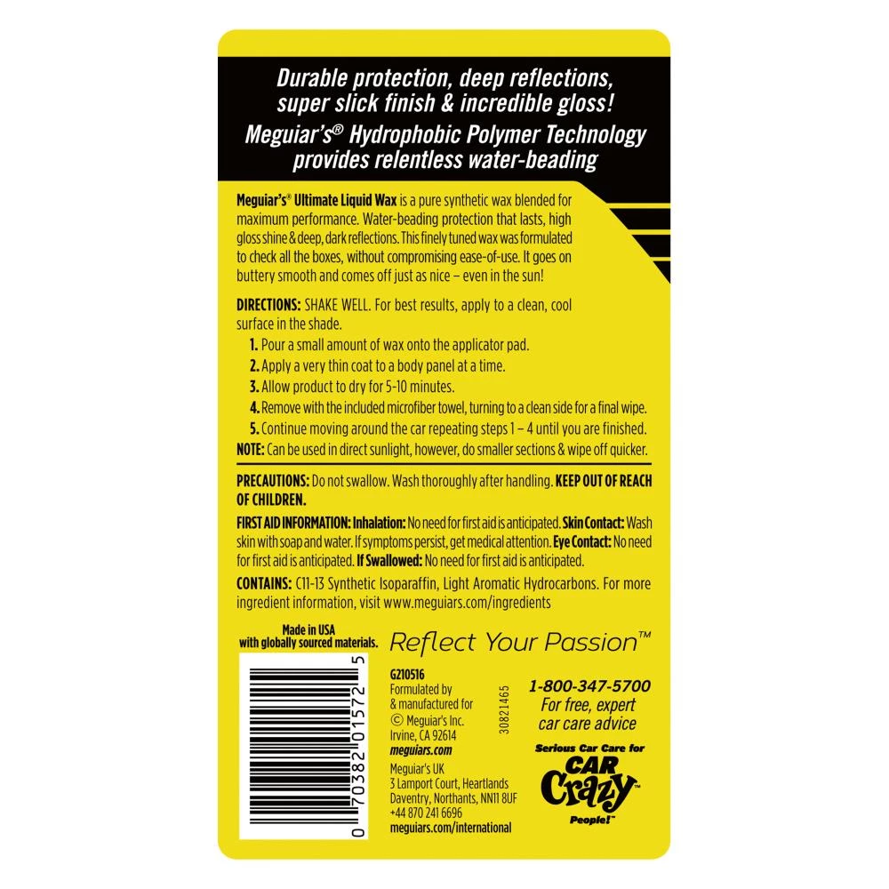 Meguiar’s Ultimate Liquid Wax is a premium paint protectant with a pure synthetic wax blend for maximum performance. The improved formula now delivers even better durability than before. Meguiar’s proprietary Hydrophobic Polymer Technology increases surface tension for relentless water beading action that lasts. This advanced formula also delivers deep, dark reflections, incredible gloss and shine while leaving a slick finish. This finely tuned wax was formulated to check all the boxes, without compromising ease of use. It goes on butter smooth and comes off just as nice, even in the sun! Premium foam applicator and microfiber towel included. Ultimate is also available in a paste wax.