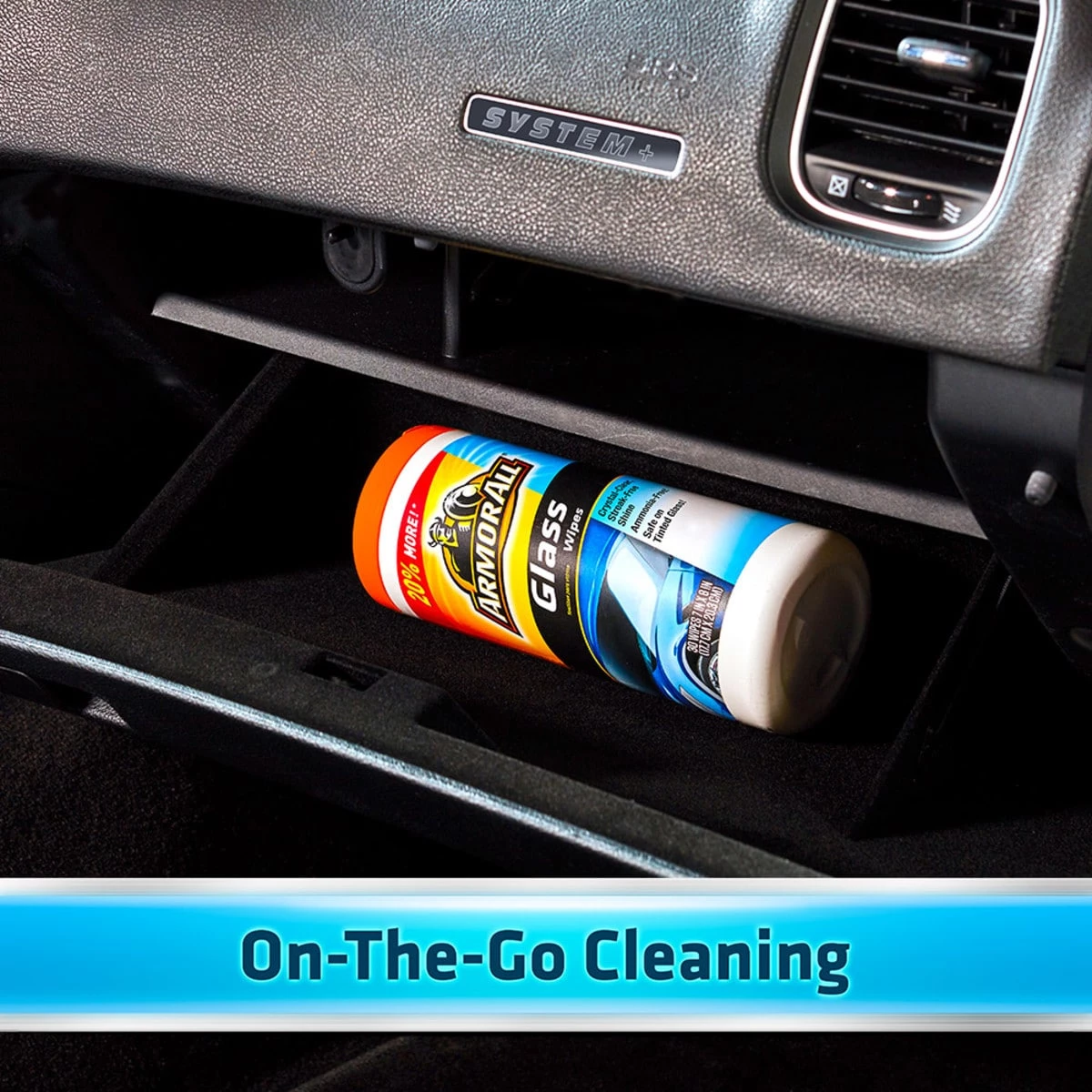 Your car’s delicate surfaces are too important to trust to a household cleaner. Some household glass cleaners contain ammonia, which may damage automotive surfaces. Armor All® glass wipes are ammonia free and are specially formulated for the toughest automotive jobs, easily removing filmy residue, road grime, bugs, fingerprints and more. Convenient, disposable Armor All® glass wipes deliver spotless, sparkling glass with amazing clarity and shine with no streaking or hazing. Features a moisture lock lid that keeps the wipes from drying out for one year after purchase.
