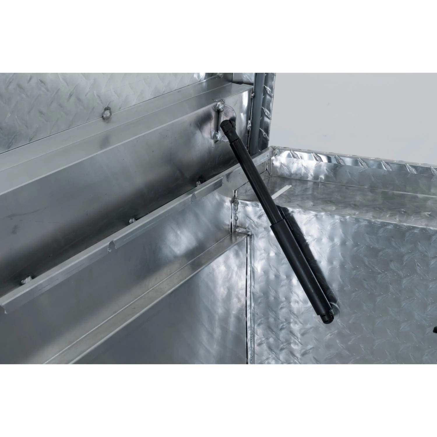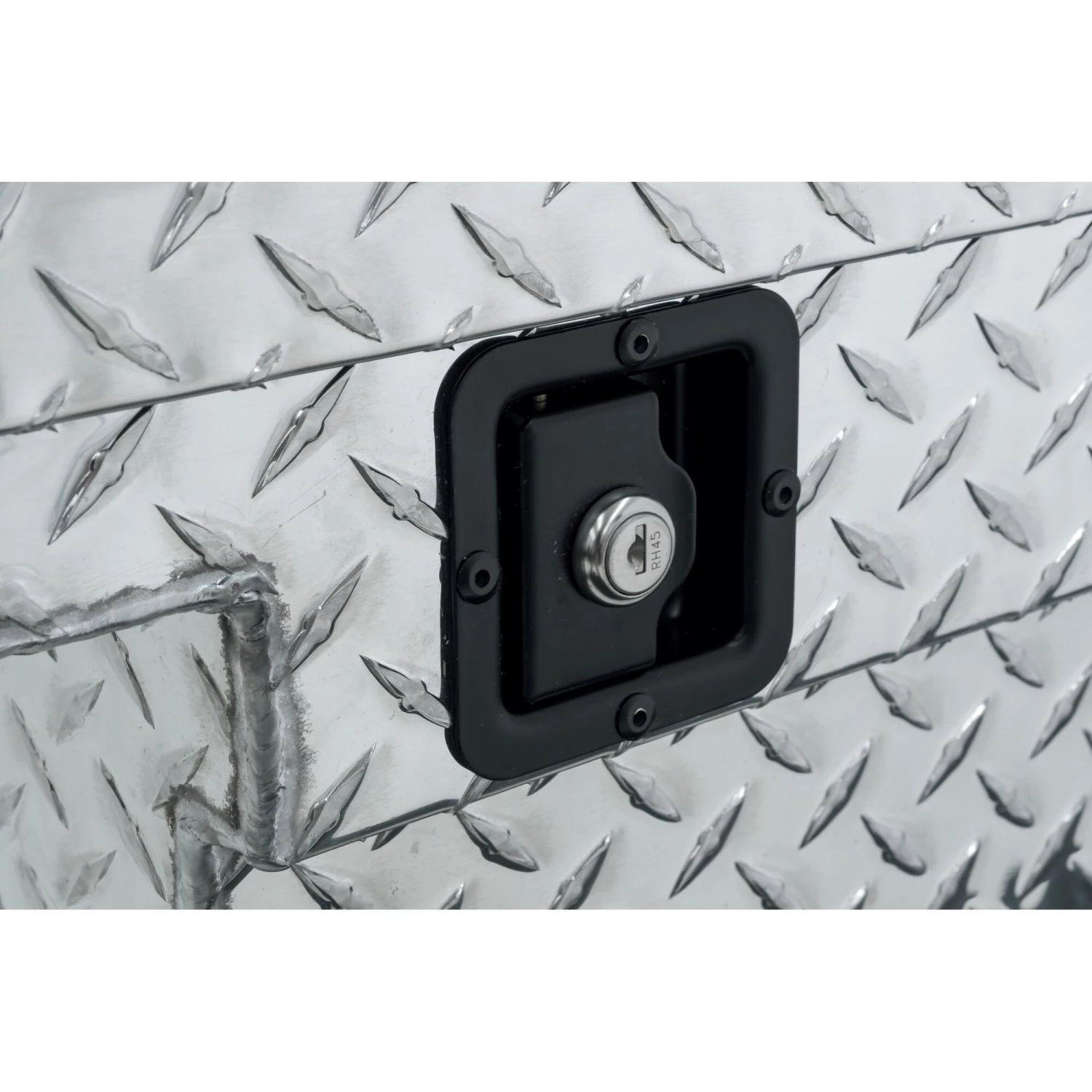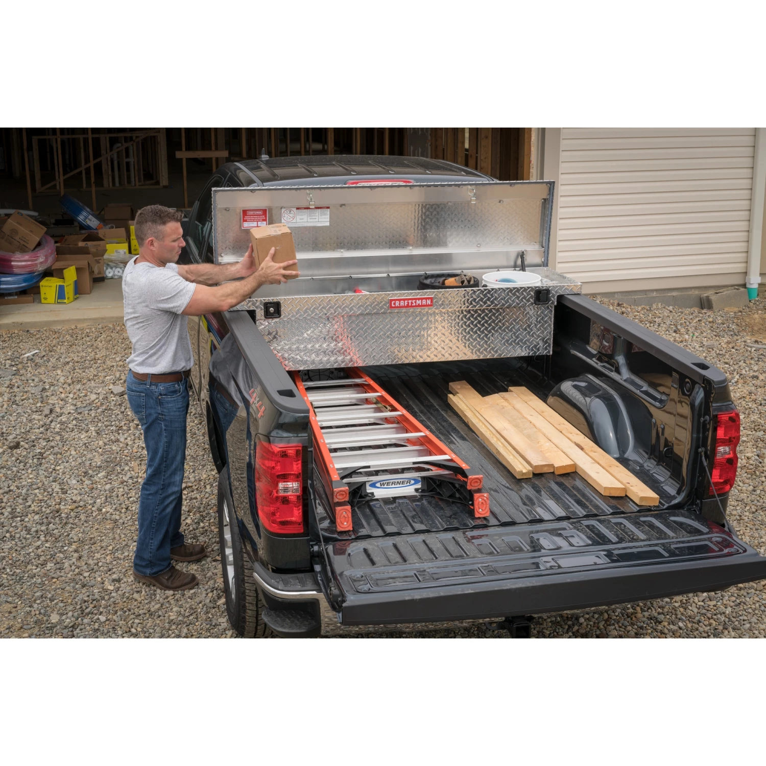 Fully welded aluminum construction and weather block seal protects your stored items. Easy-to-use ergonomic paddle handles locks on the driver side. Low profile allows greater visibility through rear window. Fits most full-sized pickups.