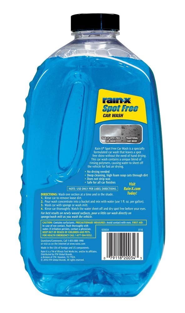 Rain-X Spot Free car wash is a specially formulated car wash that leaves a spot free shine. This car wash contains a unique blend of rinsing polymers, causing water to sheet off the vehicle for fast air drying. No towel drying needed with this unique car wash! Car washing has never been so convenient!