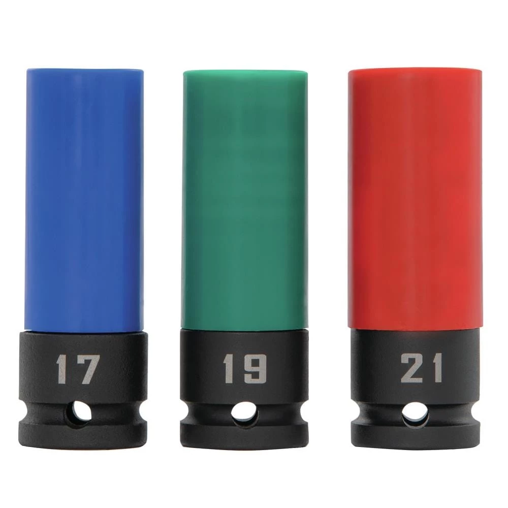 The CRAFTSMAN® 3-piece Wheel Socket Set is designed to protect wheel paint and surface finishes and keep them looking their best. Each socket features a color coded plastic sleeve and plastic insert to help prevent scratching wheels and lugnuts. The thin wall allows more between the lugnut and the wheel surface. These impact-grade sockets are constructed from cro-moly steel for superior durability and are stored in a convenient blow-molded case.