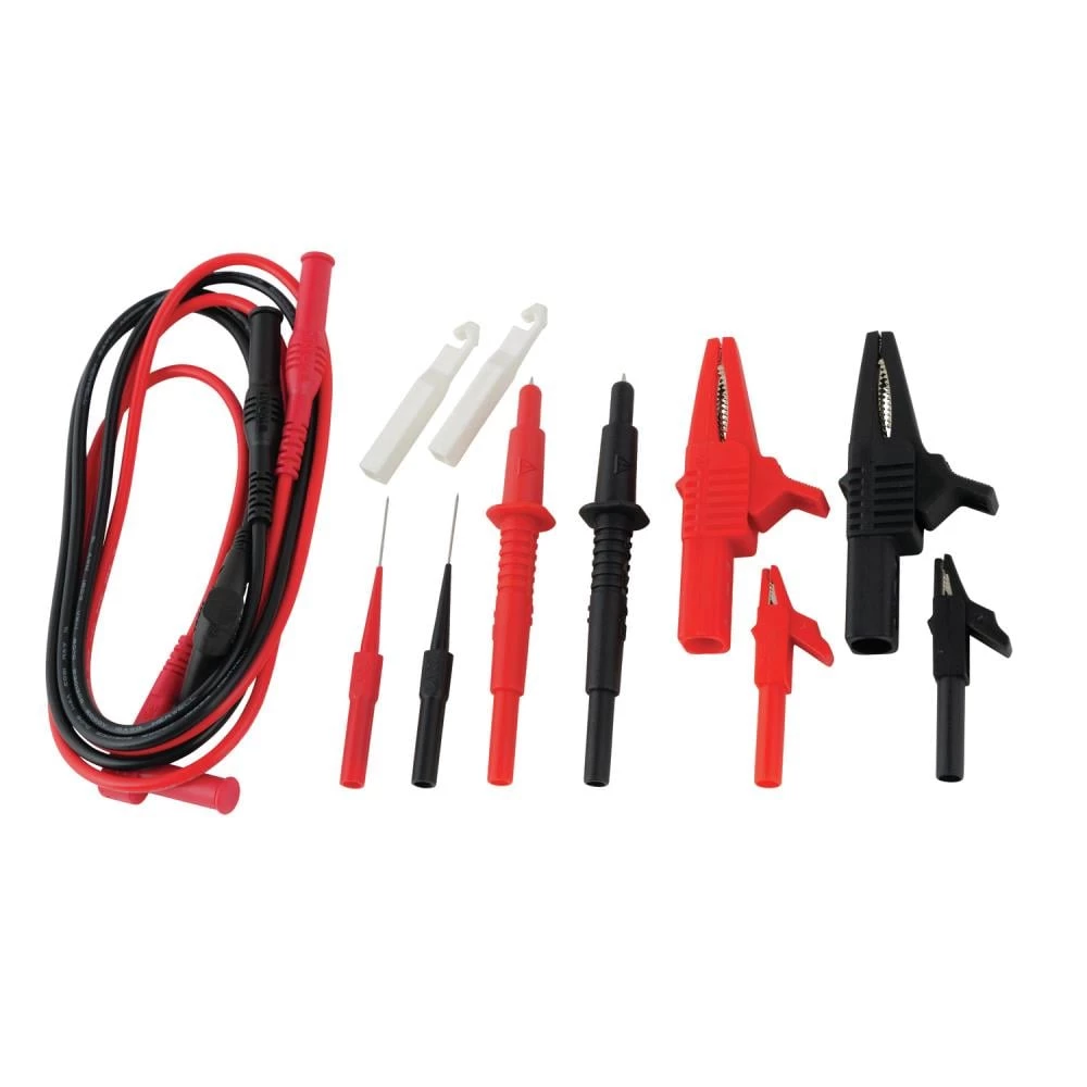 - Includes: Lead Extensions, Shielded Alligator Clips, Test Probes, Small Alligator Clips and Back Probes with Cable Piercer Adaptor