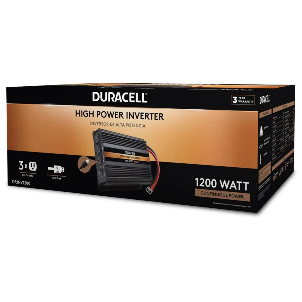 - Ideal for outdoor recreation, mobile entertainment and job sites, the Duracell 1200 Watt inverter supplies up to 1200 Watts of continuous power and 2400 Watts of peak power using your car’s battery current