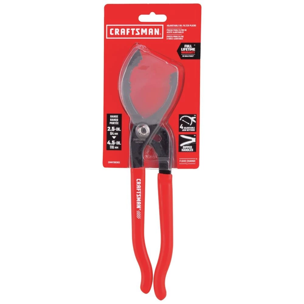 The CRAFTSMAN® Locking Oil Filter Pliers are a universal tool to remove engine oil filters between 2-1/2-in and 4-1/2-in (64mm-116mm) in diameter. Large rubber coated grips provide excellent leverage for stubborn filters. Specially shaped teeth within the plier jaws help grip metal engine oil filters.
