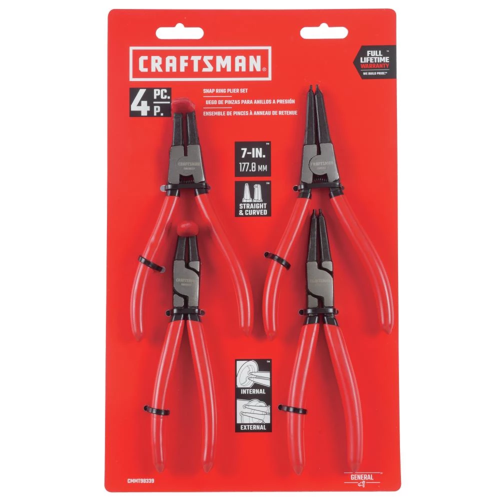 The CRAFTSMAN® 4-Piece Snap Ring Plier set comes with external, internal, straight and bent pliers to make sure you have the tool for almost any job. The hardened steel pliers feature rubber dipped handles for durability and comfortable use. Snap rings (or retaining rings) hold components or assemblies onto a shaft or in a housing when installed into a groove. Snap rings have applications both in the garage and around the house. The 4-Piece Snap Ring Plier set allows you to easily remove or replace these critical components.