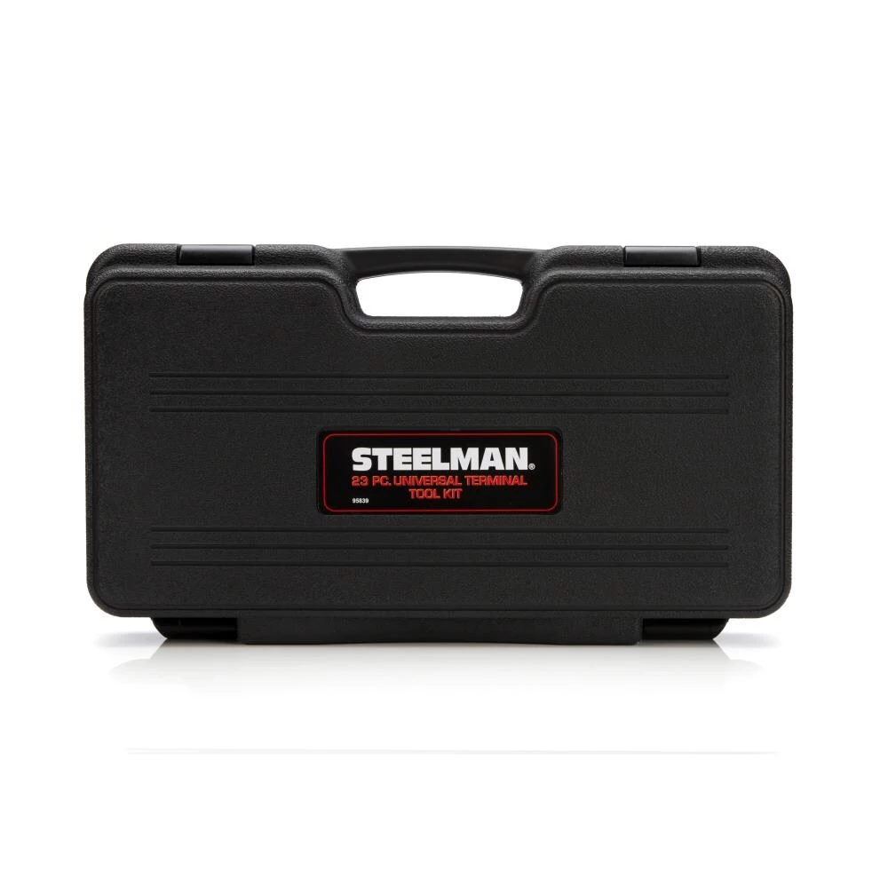 As many technicians know, automotive electrical terminal blocks are designed to hold wires amid the bumps and vibrations experienced in modern cars and trucks and not let go or loosen so when it comes time to replace or repair those blocks or wires, they never want to let go and special tools are needed to separate them. The STEELMAN 95839 23-Piece Universal Terminal Tool Kit was designed to do just that, to let you separate the wires from their terminal blocks without causing damage to either. These connector pin release tools are made with non-magnetic stainless steel tips on chrome-plated hollow brass shafts mounted in comfortable TPR layered polypropylene handles. The tools included in this kit will work on terminals found in a wide variety of BMW, Volkswagen, Audi, Jaguar, Porsche, Saab, Skoda, Ford, Renault, Citroen, Chrysler, Fiat, Honda, Mazda, Mitsubishi, Toyota, Seat, and Opel vehicles. A convenient application reference chart listing tool shapes, sizes, and compatible manufacturers is included inside the blow-molded plastic storage case. The following tools are included in this set: 5mm x 20.5mm, 4.37mm x 24.5mm, and 3.25mm x 20mm tube; 0.9mm x 14mm, 0.9mm x 16mm, 1.6m x 15mm, 1.55mm x 20mm, 1.55mm x 17mm, 1.6mm x 20mm, 1.6mm x 24mm, and 1.6mm x 26mm flat twin blade; 1.6mm x 20mm flat twin (angle tips); 1.15mm x 18mm, 1.8mm x 18mm, and 3mm x 18.5mm flat blade; 1.65mm x 23mm, and 1.8mm x 18mm flat blade chisel tip; 1mm x 18mm square blade; 1mm x 18mm flat notched blade; 1mm x 24mm flat U-notch blade; 1mm x 9mm triple flat blade; 0.9mm x 19mm pin blade; and 1mm x 19mm pick blade.