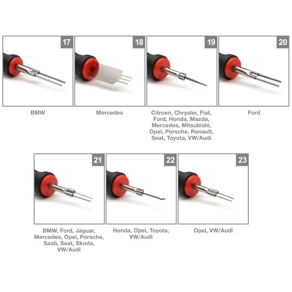 - Tools fit terminals used in BMW, Mercedes, VW, Audi, Jaguar, Porsche, Saab, Skoda, Ford, Renault, Citroen, Chrysler, Fiat, Honda, Mazda, Mitsubishi, Toyota, Seat and Opel vehicles