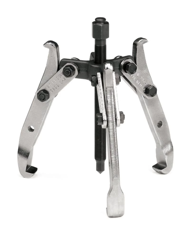 The 3561 jaws reverse for inside and outside pulling. Three-point grip applies a parallel pull. Large spread and reach accommodate pulleys, flywheels, and gears. Includes blow mold case for storage. Jaw capacity: 5 In.. maximum reach: 3-1/2 In.. capacity: 2 ton. Center screw size: 3/8 x 24. Screw length: 4-7/8 In.. jaw thickness upper/lower: 3/16 In. to 1/8 In.. jaw width upper/lower: 5/16 In. to 1/2 In.. weight: 1.3 lb.